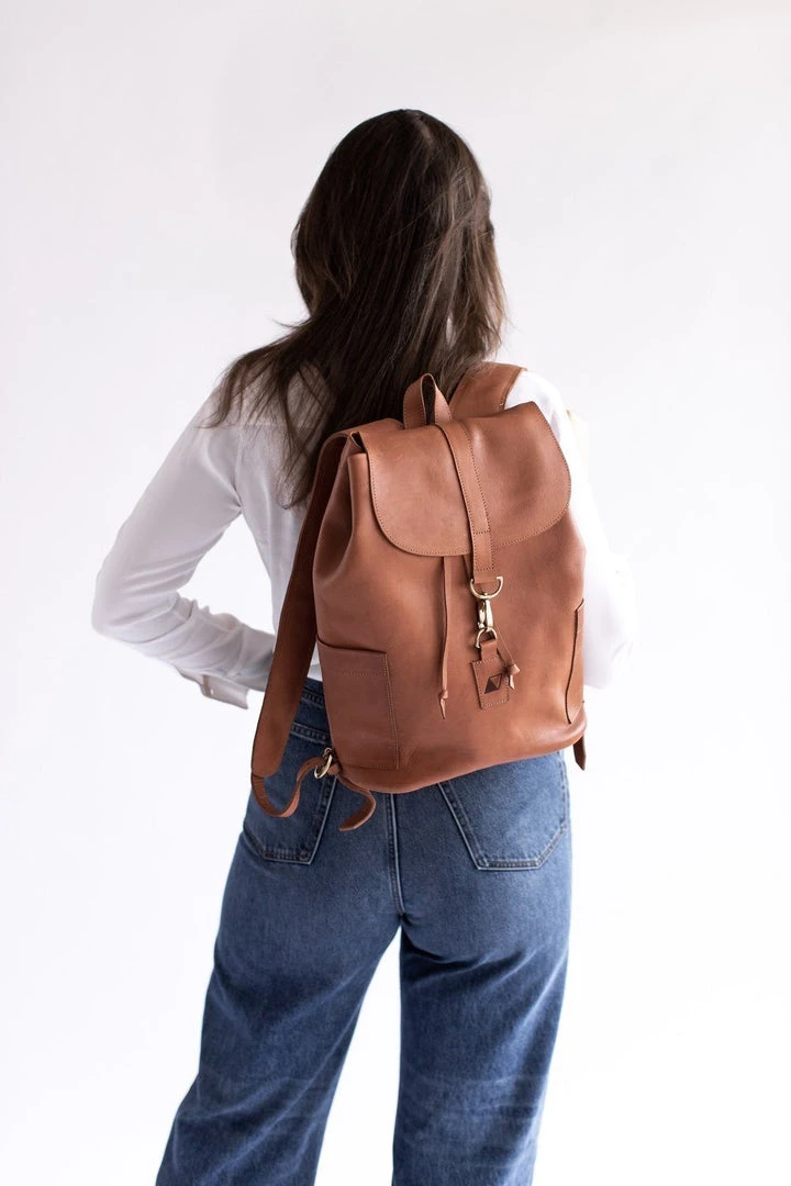 Beauty meets function in the Chestnut Adelaide Backpack, a generously sized, chic backpack for work, travel, and everyday use. Handcrafted by artisans using eco-friendly, vegetable tanned leather. Featuring a padded laptop pocket, two interior and exterior pockets, a back safety pocket, and trigger-hook closure.