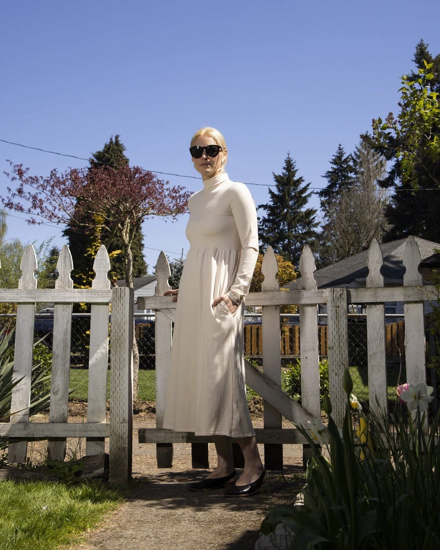 The softest, most luxe rib knit with amazing stretch and recovery so this dress will never lose its beautiful shape. This dress offers sophistication and versatility. The midi length is classy and modern, and the fitted sleeves contour gorgeously on the body. This fabric is deadstock modal rib knit with 3% spandex content for amazing bounce and weight.