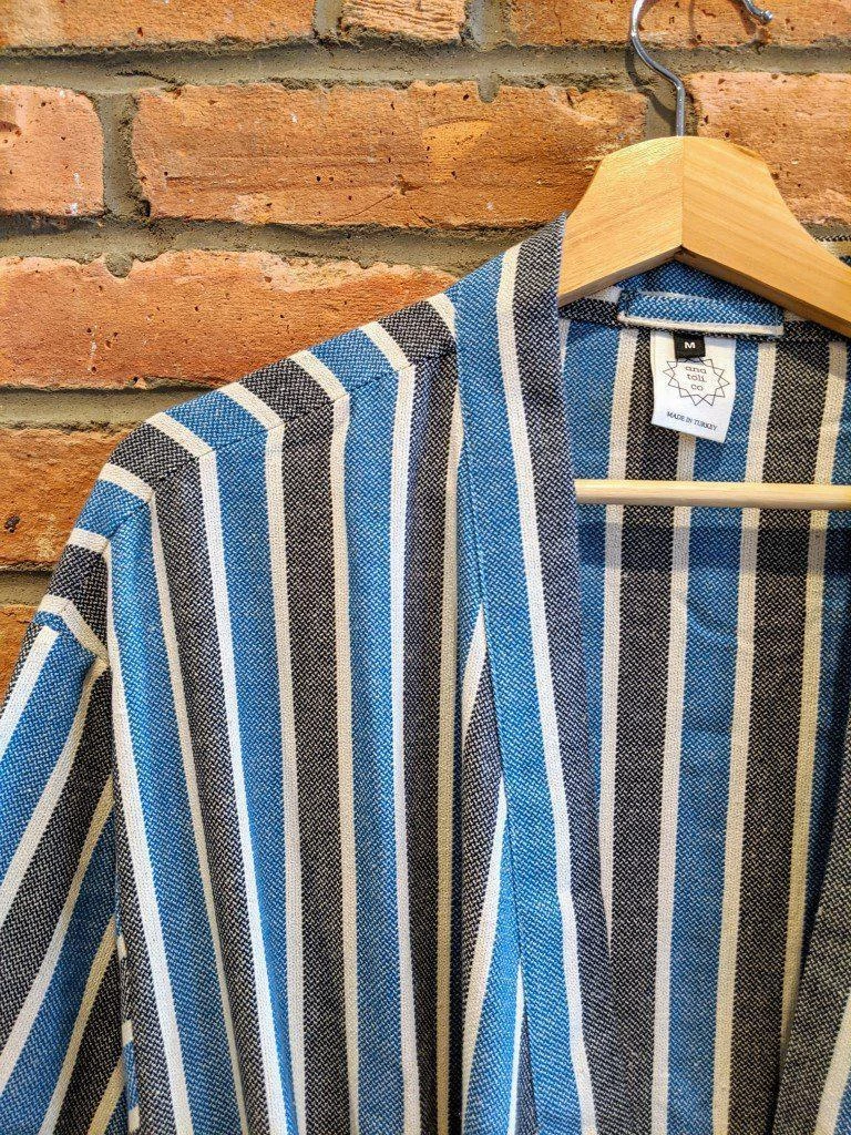 The blue striped River Turkish Robe is lightweight for all day lounging. Each is hand-loomed by local artisans in Turkey using the best Turkish cotton and following the authentic traditional technique. This Turkish towel material is surprisingly absorbent and quick-drying.