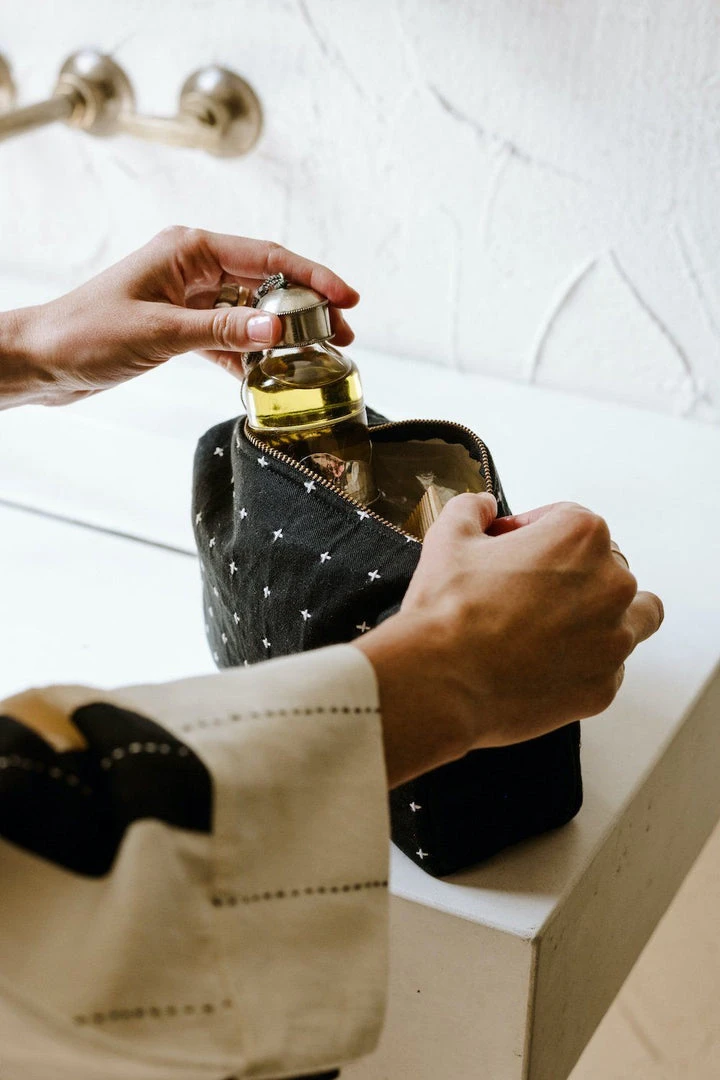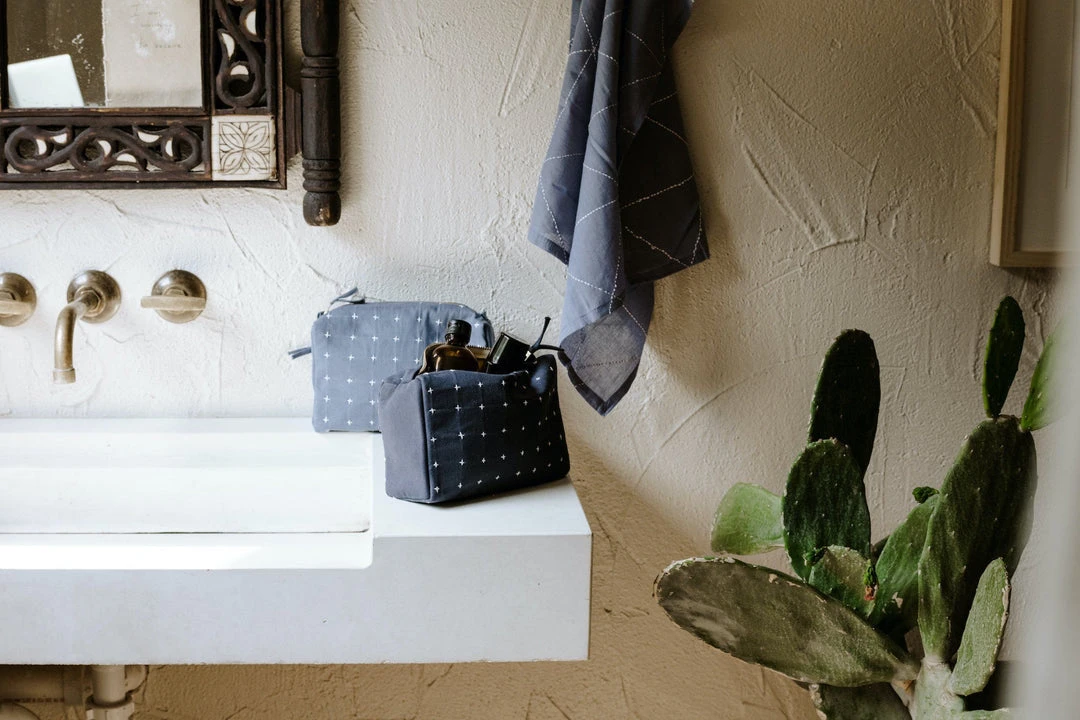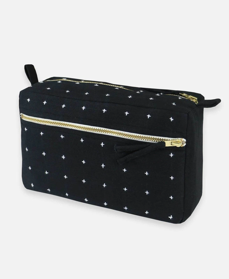The size of this compact toiletry bag is perfect for your daily essentials and favorite products. The flexible organic-cotton canvas, with a hand embroidered cross stitch, is designed to easily fit into any overnight bag, purse or tote.
