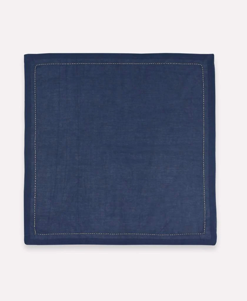 A hand embroidered napkin set, ethically handcrafted from soft organic cotton in classic navy blue. Detailed stitching in gold thread adds a stylish accent perfect for everyday or special occasion table settings. Pairs perfectly with the matching table runner.