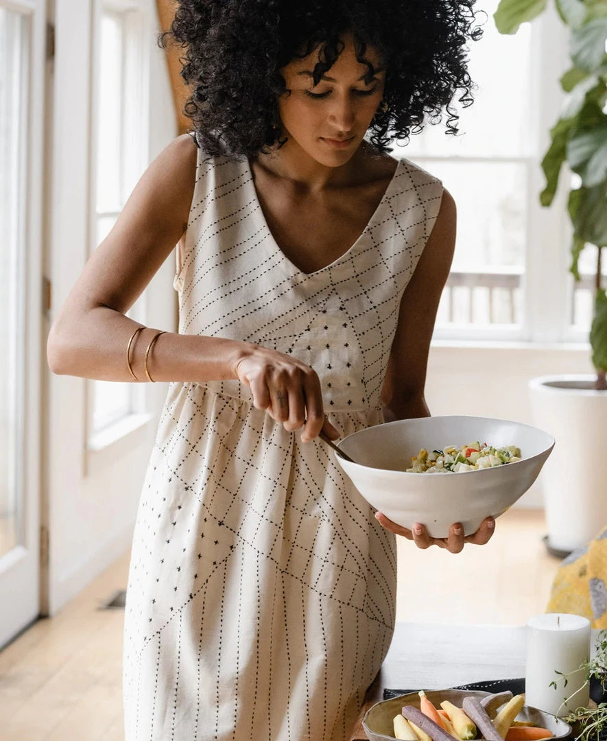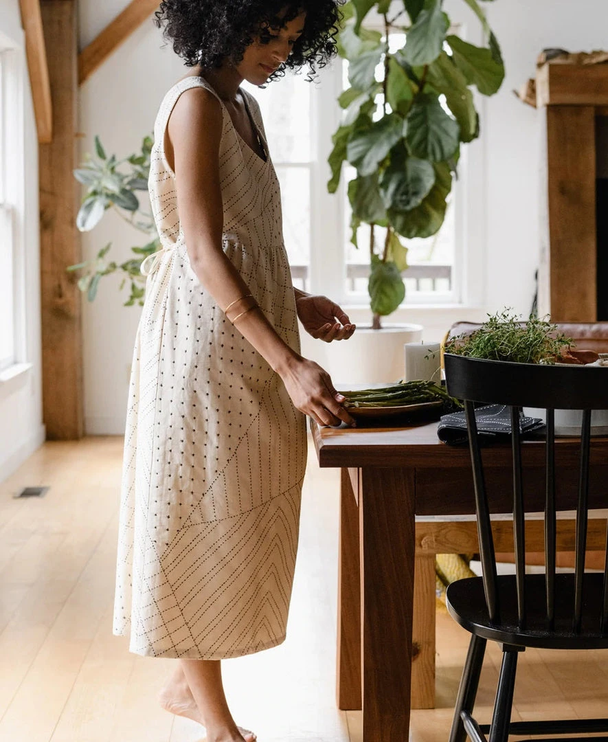 The contrasting textured stitch patterns of the Tie Back Midi Dress create a wearable work of art for a fresh, modern look. This structured midi dress sits just above the natural waist featuring bust darts for a streamlined look and a gathered skirt grazing mid-calf for a flattering, relaxed fit. A thoughtfully designed V-neckline and wide tank straps finish this look for easy undergarment concealment.  Pair with your favorite sandals and minimalist jewelry to complete the look.