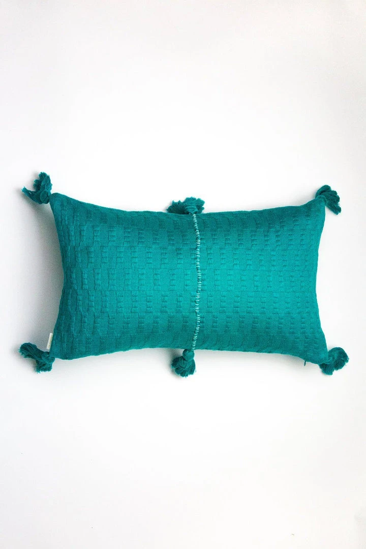 This jade pillow is inspired by traditional textiles from Almolonga, Guatemala. The cotton used to make this pillow was handwoven by artisans using a back-strap loom.