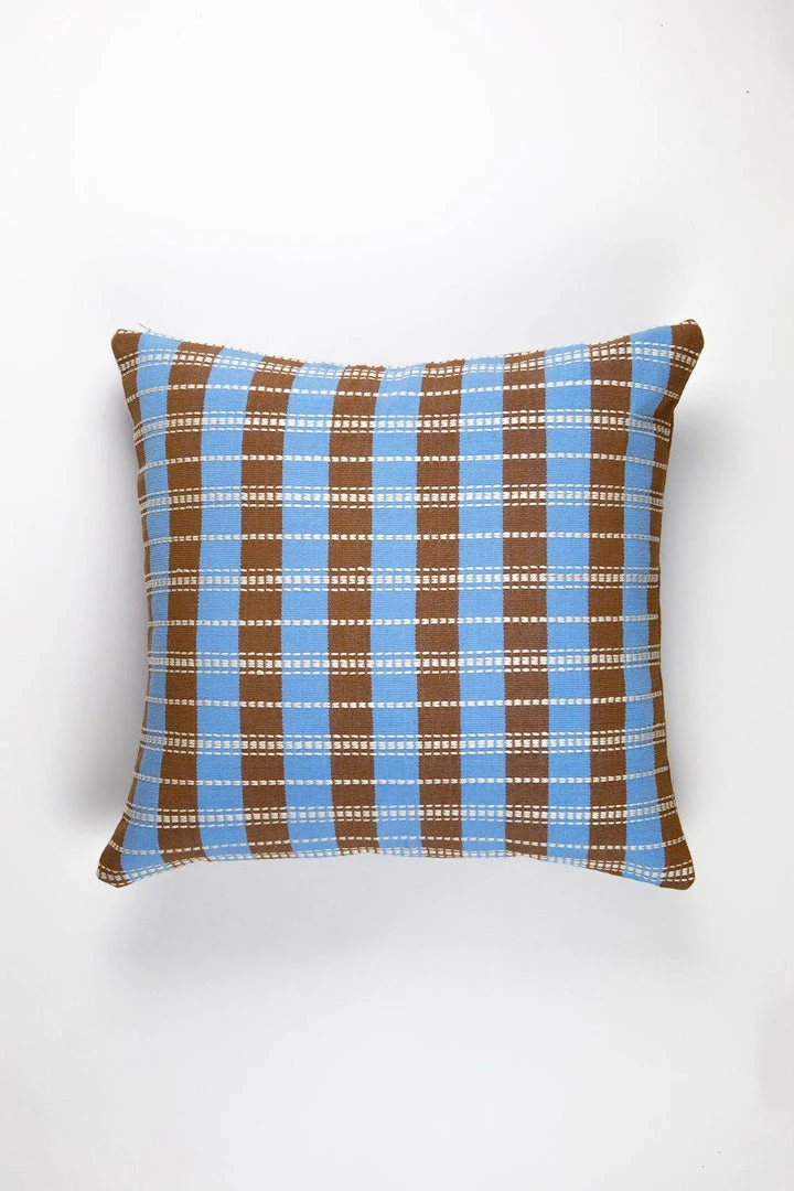 This blue pillow was handwoven on a back-strap loom by artisans from the village of Nahuala, Guatemala.