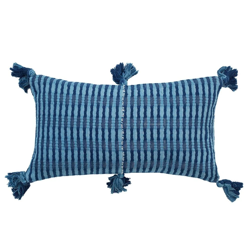 This indigo pillow is inspired by traditional textiles from Almolonga, Guatemala. The cotton used to make this pillow was handwoven by artisans using a back-strap loom.