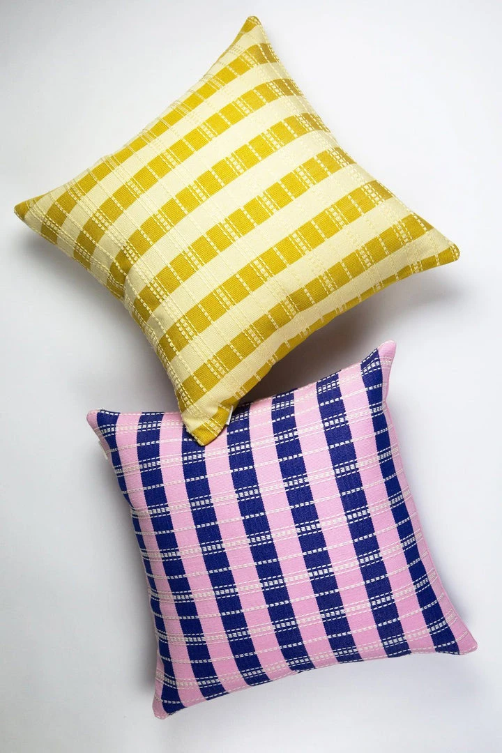 This baby pink pillow was handwoven on a back-strap loom by artisans from the village of Nahuala, Guatemala.