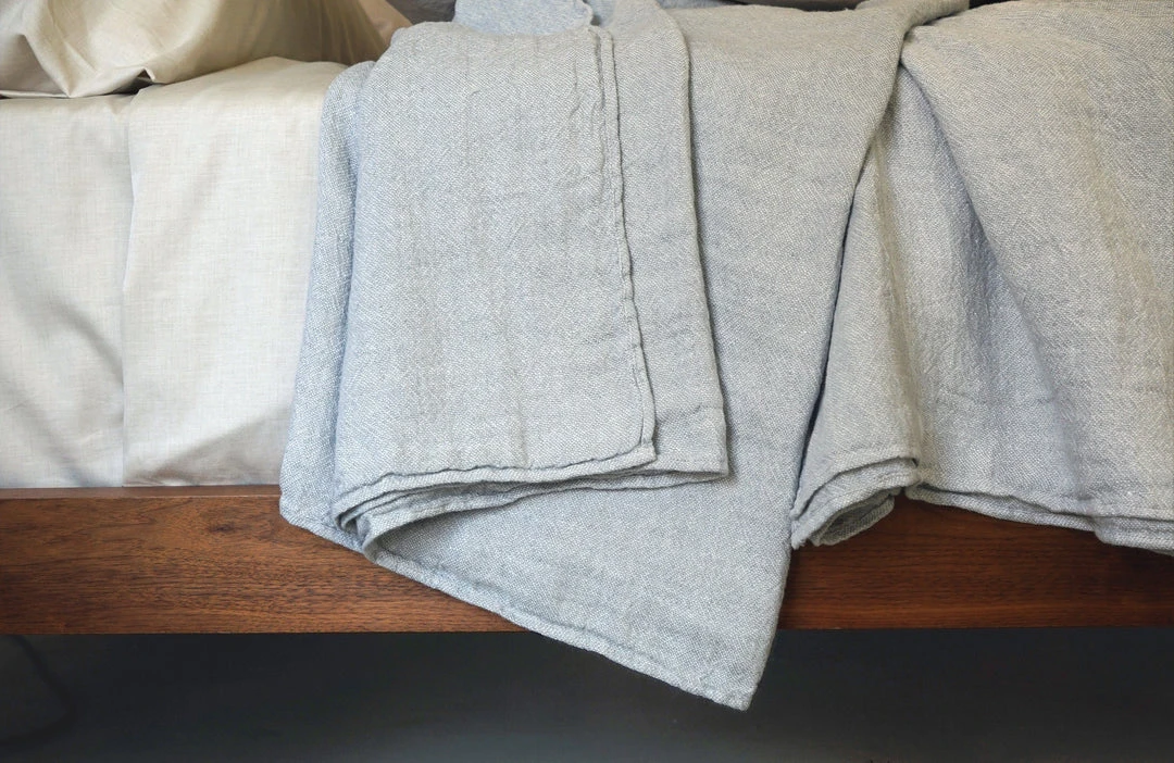 The linen used to make this blanket has been dew retted. This is the most natural way to extract pectins (what is woven into linen) from the flax. It uses the least amount of water of all retting processes and is completely sustainable.