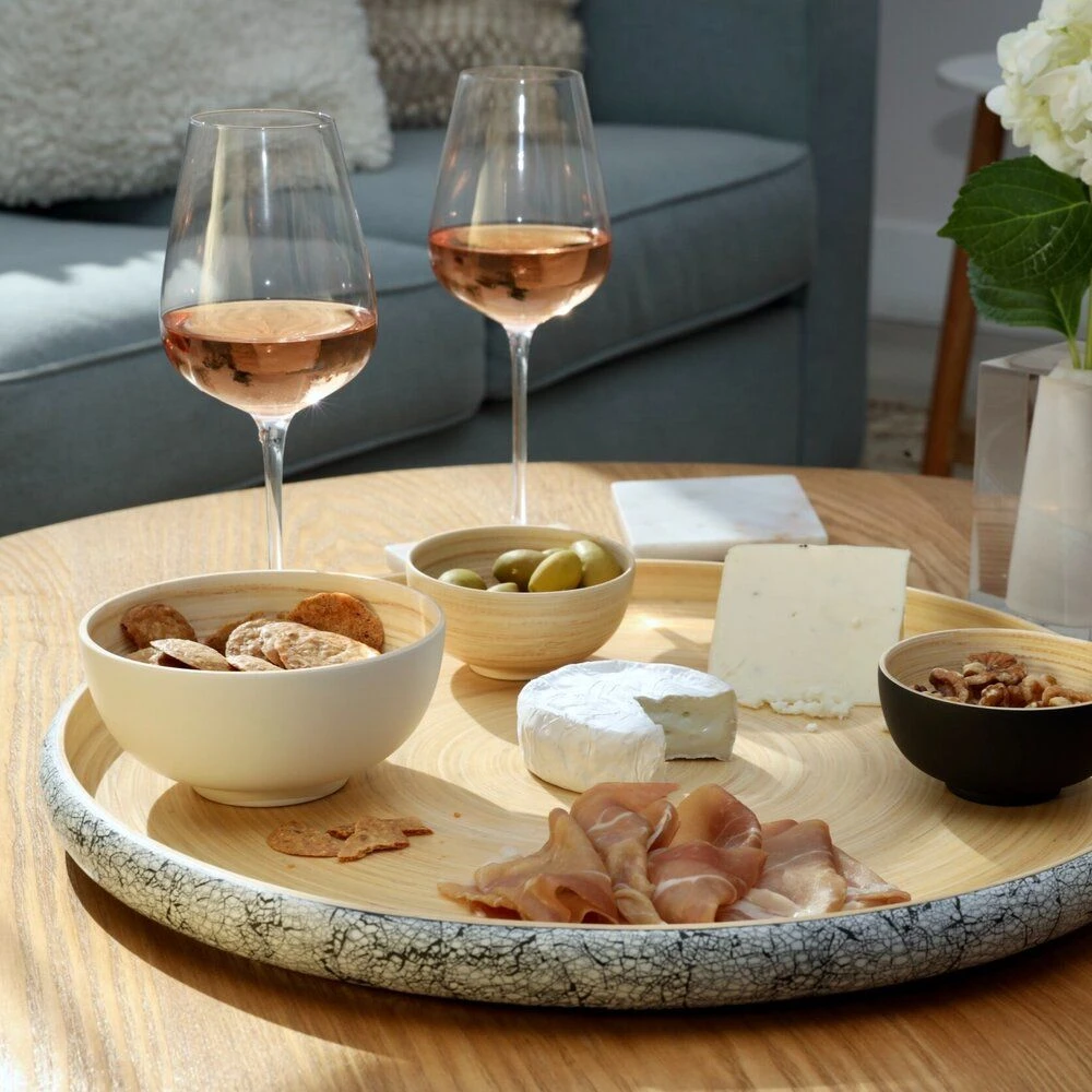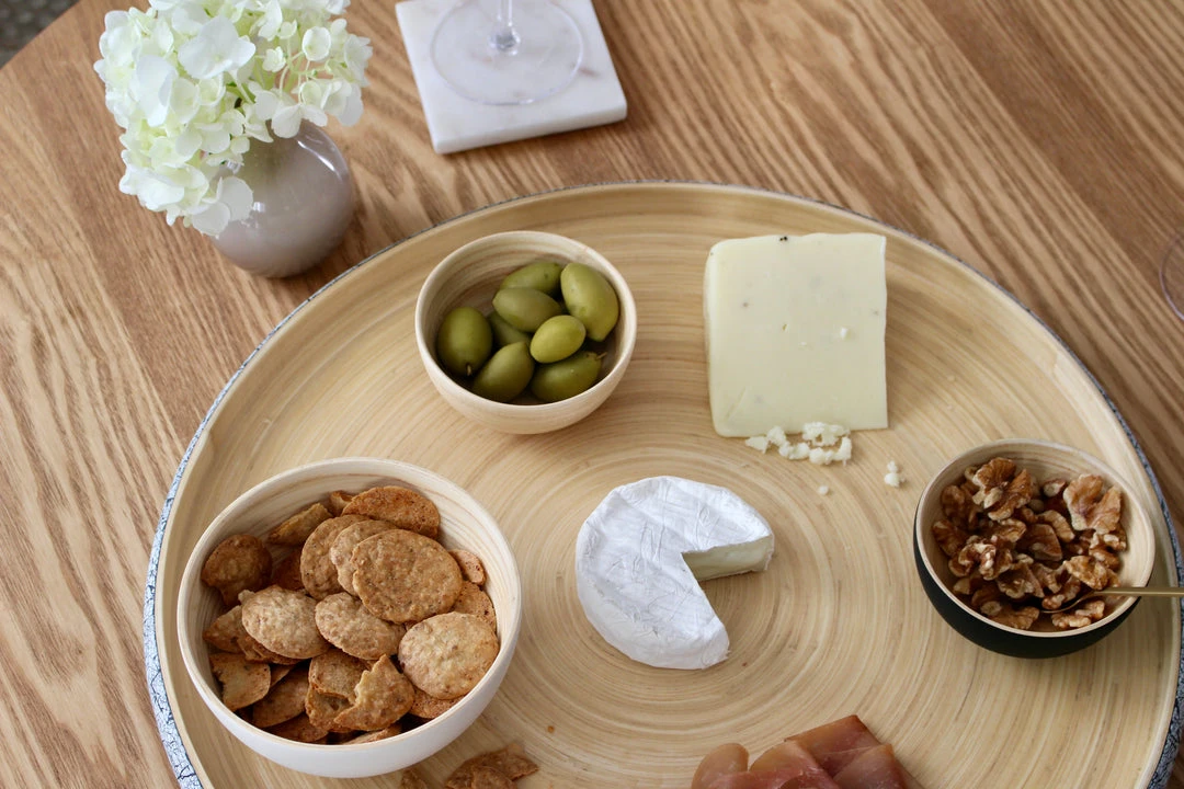 Elevate the way you entertain with the Khay Bamboo Serving Tray. This tray makes it easy to serve vegetables, appetizers, bouchées, cheese, sushi and more, all in sleek style. These trays are also perfect as a coffee table platter, bathroom organizer or plant holder.