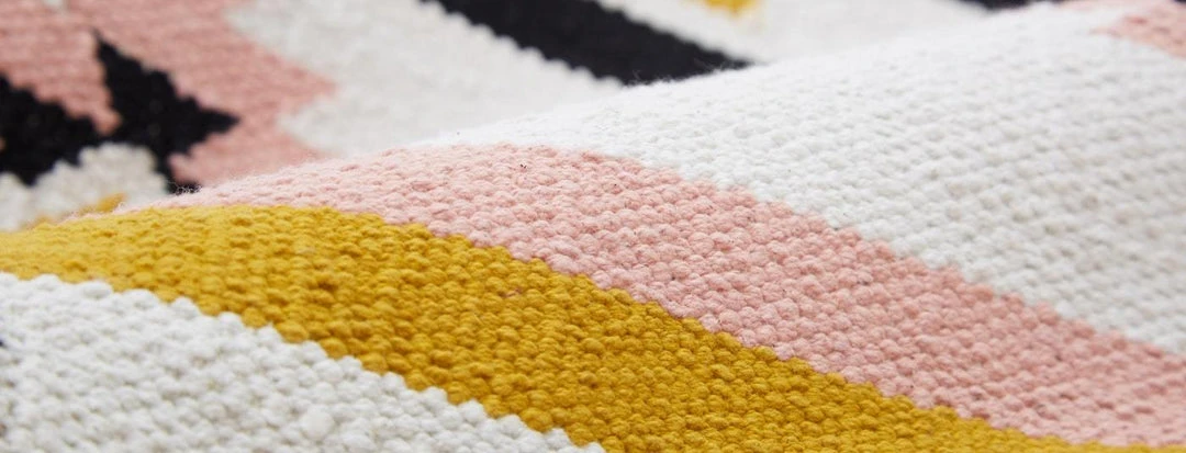This handmade rug is inspired by the colors of the desert sky. Woven by artisans on handlooms in northern India, this rug features a Kilim flatweave construction finished with fringes on the edges.