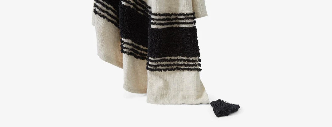 Handcrafted using the table tufting technique, this throw blanket is made from soft cotton with tufted textured borders, complete with chunky tassel trim at corners. Throw this tasseled blanket over a bed, sofa, or armchair for a sleek look.
