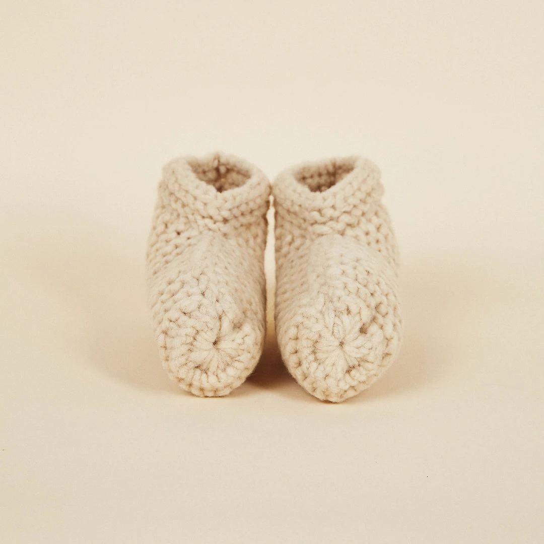 Slippers 100% hand made fair by artisan women in Patagonia using only natural sheep’s wool. With use, they will conform to the shape of the wearer’s own foot. Includes QR code with artisan info and geo-location and a repair kit to personalize or repair as needed.