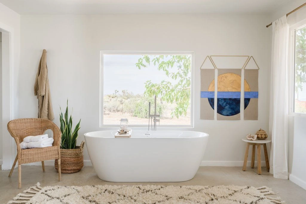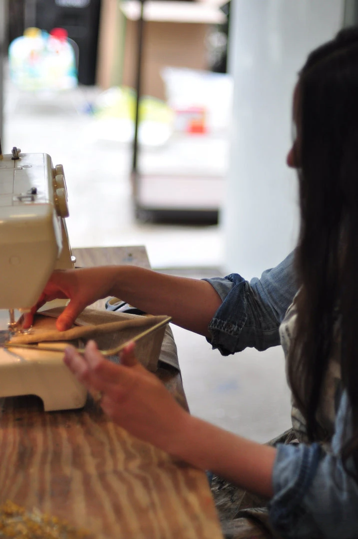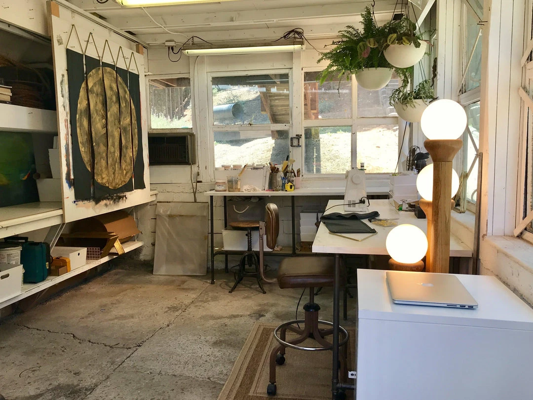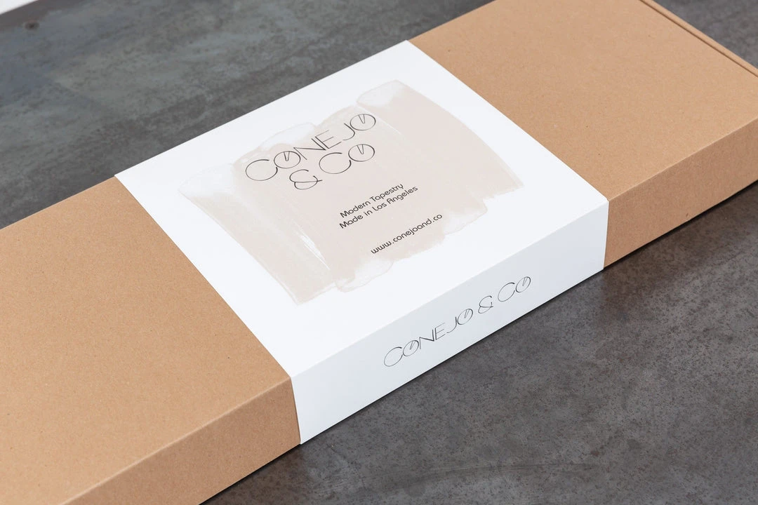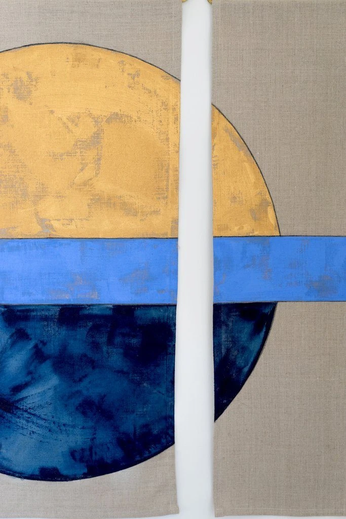 These contemporary, three-panel wall hangings are hand-painted in Los Angeles using metallic gold, cornflower, and indigo artist’s acrylics and graphite on natural linen. The raw, solid brass hardware was machined in Los Angeles as well. Each piece is made just for you, making them one of a kind.