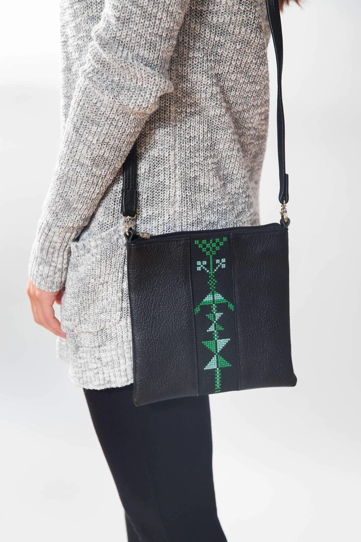 The tatreez crossbody bags are perfect for carrying the essentials, measuring 8″ x 8″ and made with black goat leather from Palestine. Each piece is hand-embroidered by refugee and low-income women artisans, made with a traditional Palestinian tatreez design and crafted with locally sourced leather in Al Khalil (Hebron). Lined with cotton and designed with an interior pocket and zipper.