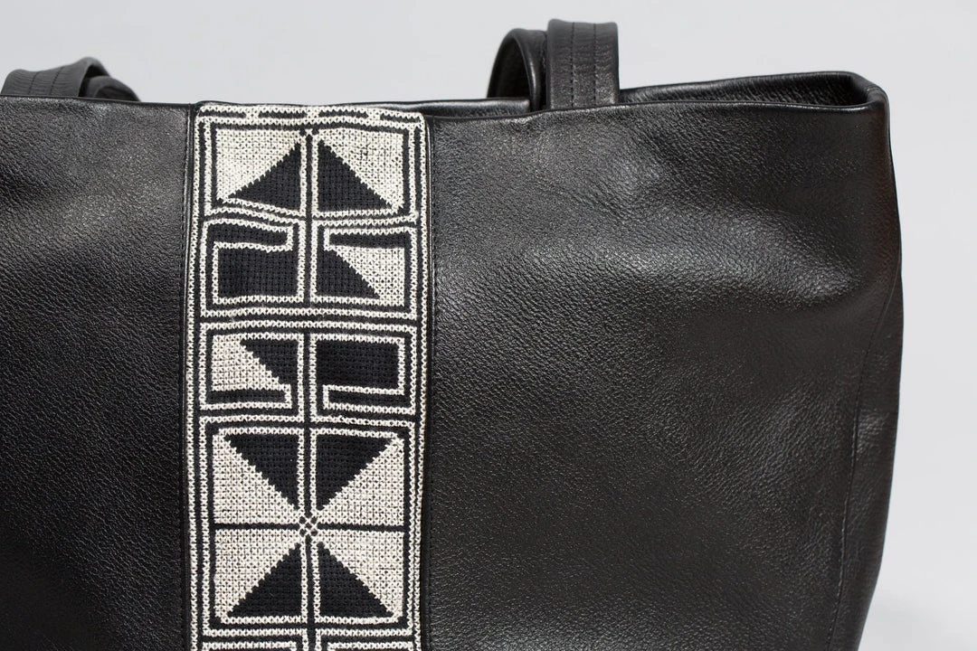 A market tote bag to carry everything you might need in a day. Each bag is hand-embroidered by refugee and low-income women artisans with a traditional Palestinian tatreez design, the “Road of Egypt” motif, and crafted with locally sourced leather in Al Khalil (Hebron). Lined with cotton and designed with an interior pocket, zipper closure and magnet snap.