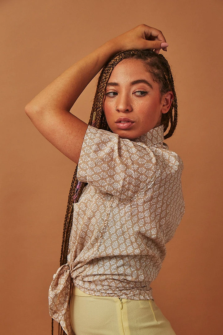 A short sleeve men’s button down shirt with a hand printed motif on a light brown background. The perfect addition to men’s sustainable wardrobes, this short sleeve button down can be dressed up or worn casually with its slim fit. Designed in Los Angeles and hand block printed in a fair trade environment in India.