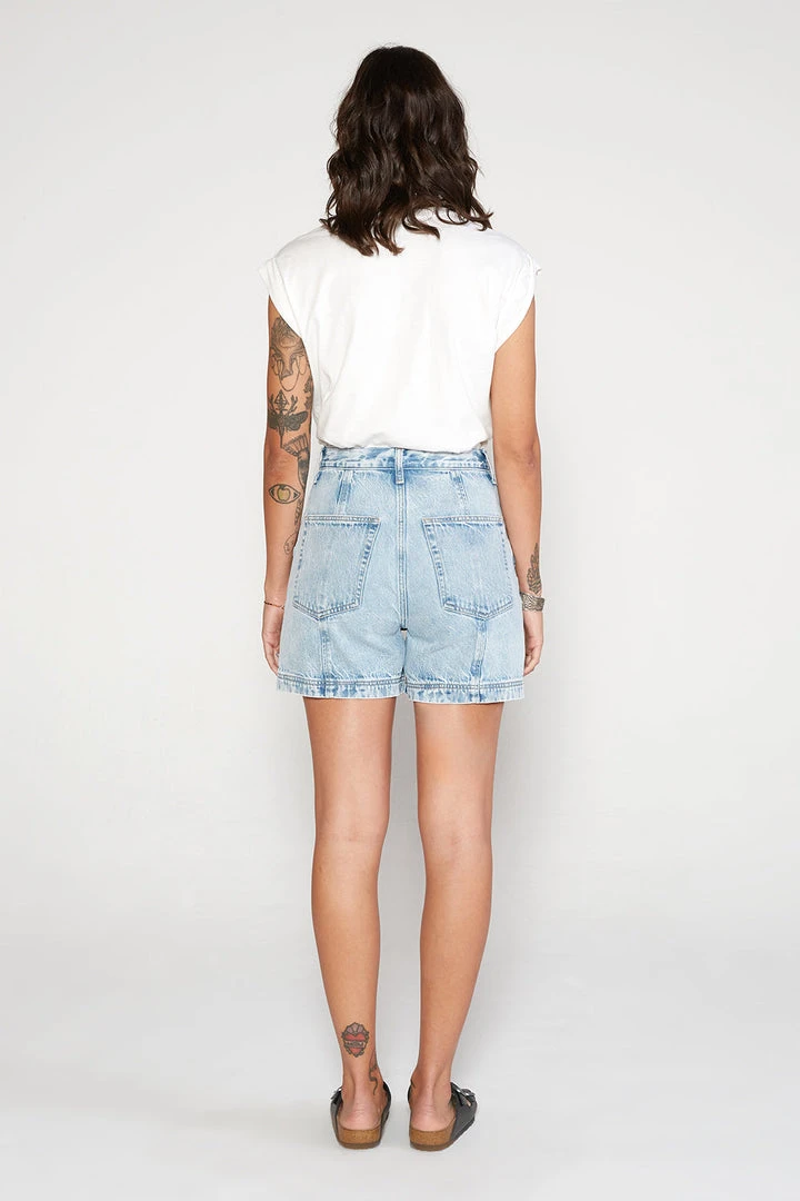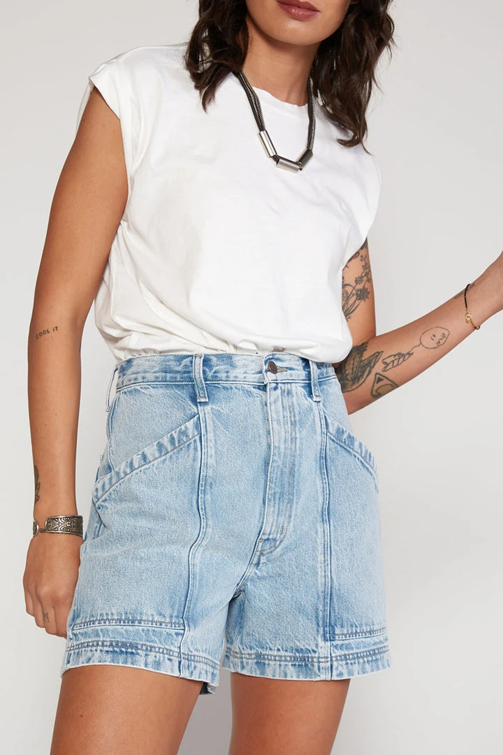 A chic, relaxed fit short in an organic cotton denim, utility pocketing and a cool marbled wash adds an edge to this high rise short with contrast seaming.