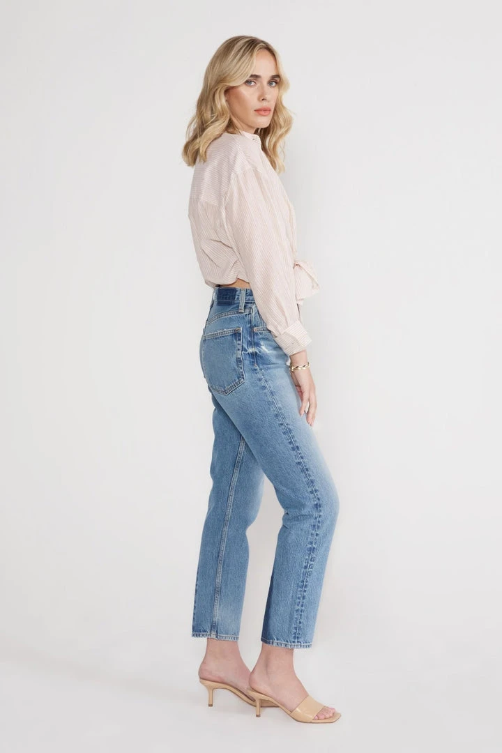 A slim straight leg jean with a high rise and vintage construction. A released pintuck adds a sharp accent at the ankle.