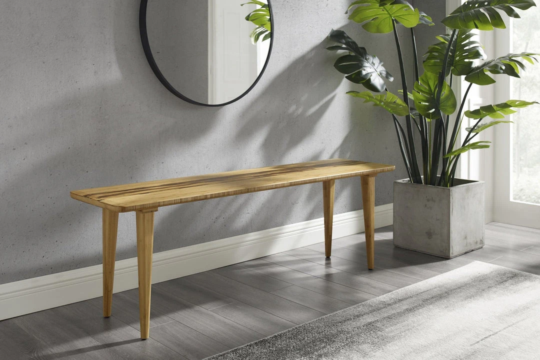 Expertly crafted in earth-friendly solid bamboo, the Azara bench is an elegant design with unlimited uses. Minimal and modern with beveled edges and tapered legs, Azara looks stunning in an entry, dining room, at the foot of your bed, or extra seating for any room. Showcasing a beautiful mix of materials, the bench seat displays a center accent crafted in solid exotic Tiger bamboo. Variation in grain and color enrich the natural beauty of bamboo furniture and make each piece unique.