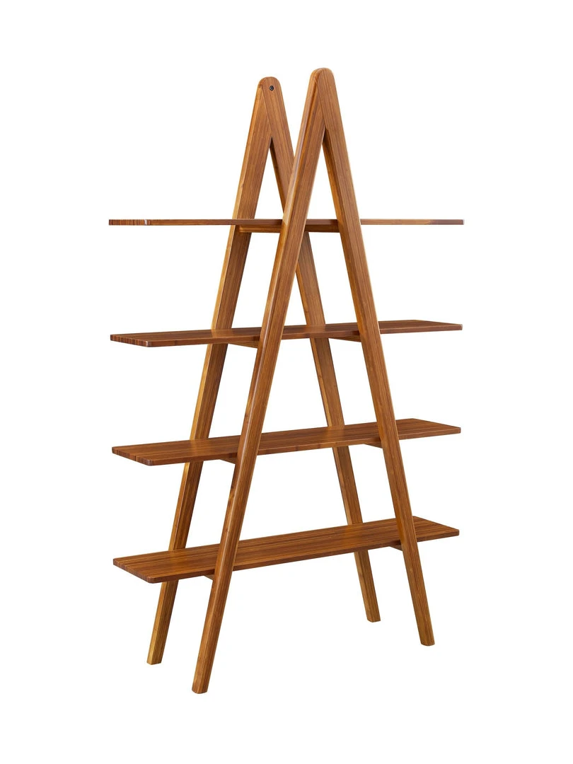 100% bamboo made modern, the Studio Plus shelf is storage that works hard while looking gorgeous. The expansive shelf features open styling with deep bamboo shelves stacking four high for tons of storage, supported on two A framed architectural supports which peak in the center at 75” high. The Studio plus shelf offers sustainable design for your home without sacrificing style. Expertly crafted in earth friendly solid Amber bamboo, the Amber color is not a stain finish, simply an innovation created using earth friendly heat, steam, and pressure. Creating a beautiful unique grain with continuous color throughout the entire material.