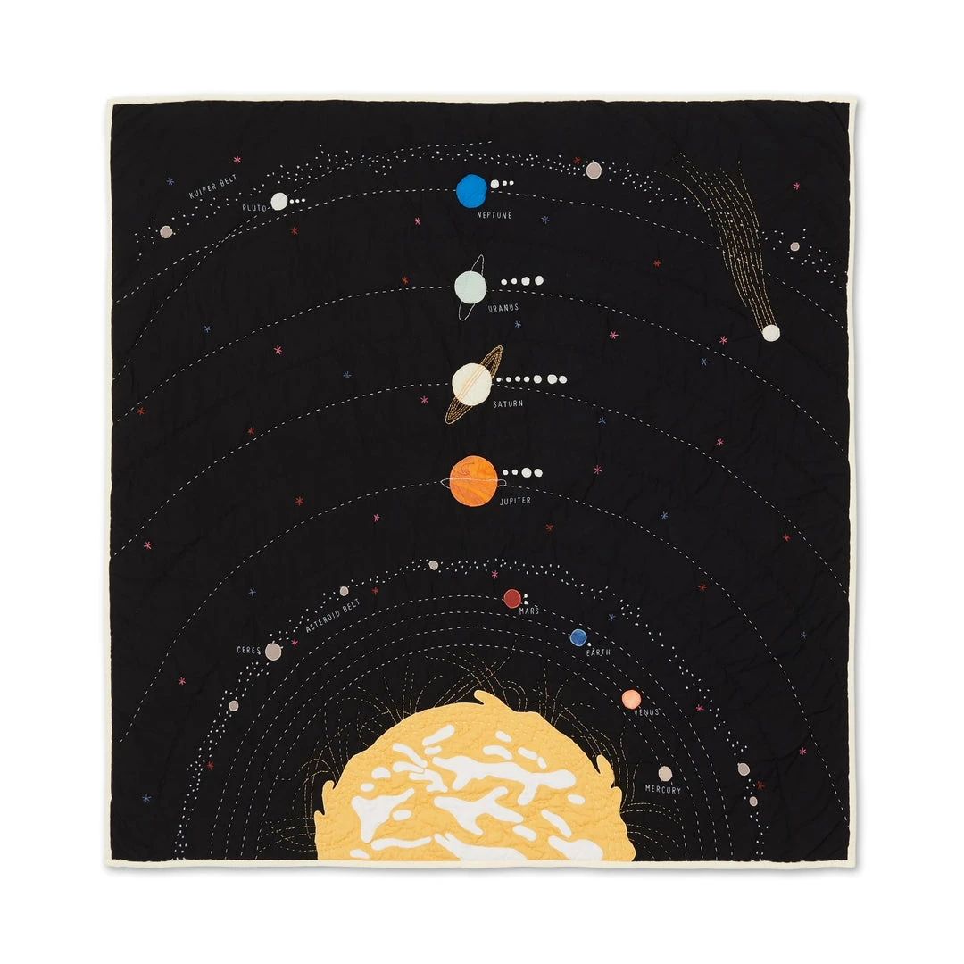 Explore the outer reaches of our Solar System with the tips of your fingers – this organic cotton quilt is sure to spark scientific curiosity in space enthusiasts both young and old. Densely packed with hand-embroidered silk details like the rings of Saturn and the dynamic surface of our constantly changing Sun.