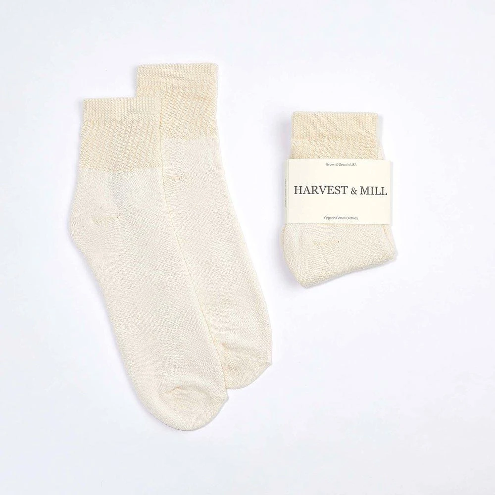 These socks are made from natural-white organic cotton. There are no dyes or bleaches used on these socks. Natural-white cotton is creamier in tone than stark bleached white. Ankle socks hit above the ankle. 6 pairs included.