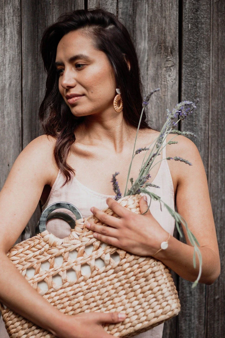 The perfect tote bag for your weekend farmer’s market trips or a day at the beach, this handmade tote bag is made of water hyacinth, an aquatic plant that grows fast and strong in the rivers of northern Vietnam. These plants are harvested and dried to be come long lasting fibers that are woven into this beautiful timeless tote bag.