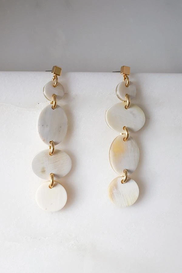 A glamorous statement, this Xinh Xan Asymmetrical Geo Buffalo Horn Long Dangle Post Earrings by Hathorway features four various circular charms made with ethically-sourced water buffalo horn on a tiny gilded square post. Add this glamorous dangle post earrings to your jewelry collection for a sustainable, sophisticated statement. Dress up for date night or elevate your weekend wear with this beauty.