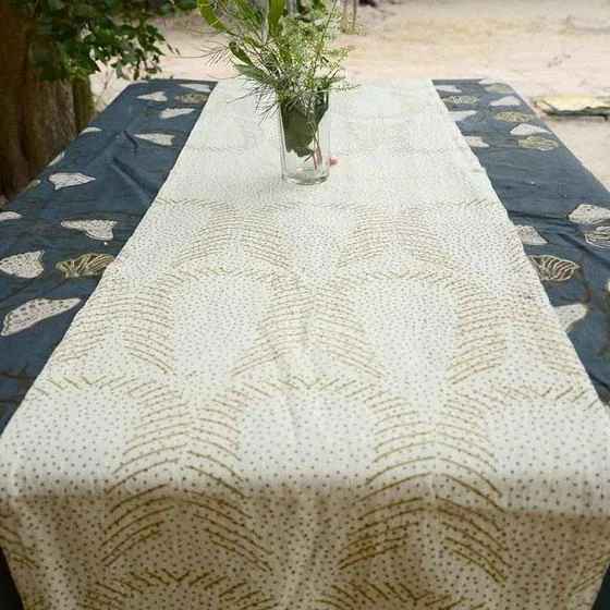 This beige and gold table runner fabric is hand block printed on hand woven organic cotton. Called the gold dust, it’s the right sprinkle of magic for your special guests. These muted colors adds casual luxury to your table.