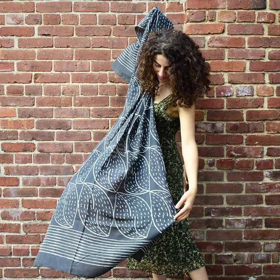 The Nimboo scarf is an abstract depiction of textural shapes found in nature. Have some fun with this black and white scarf, by adding it to any ensemble. Please note that sizes may vary 1-2 inches and color variance may occur based on the intake of natural dyes per fabric. Hand wash.