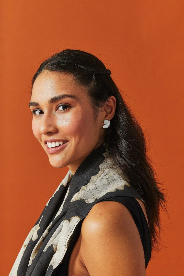 This pattern was inspired by the silhouettes of Indian palace doorways created during sunsets. This light black and white scarf, was block printed using the DABU technique, which is a mud resist. This broken effect came out so lovely – it’s the favorite scarf of this season.