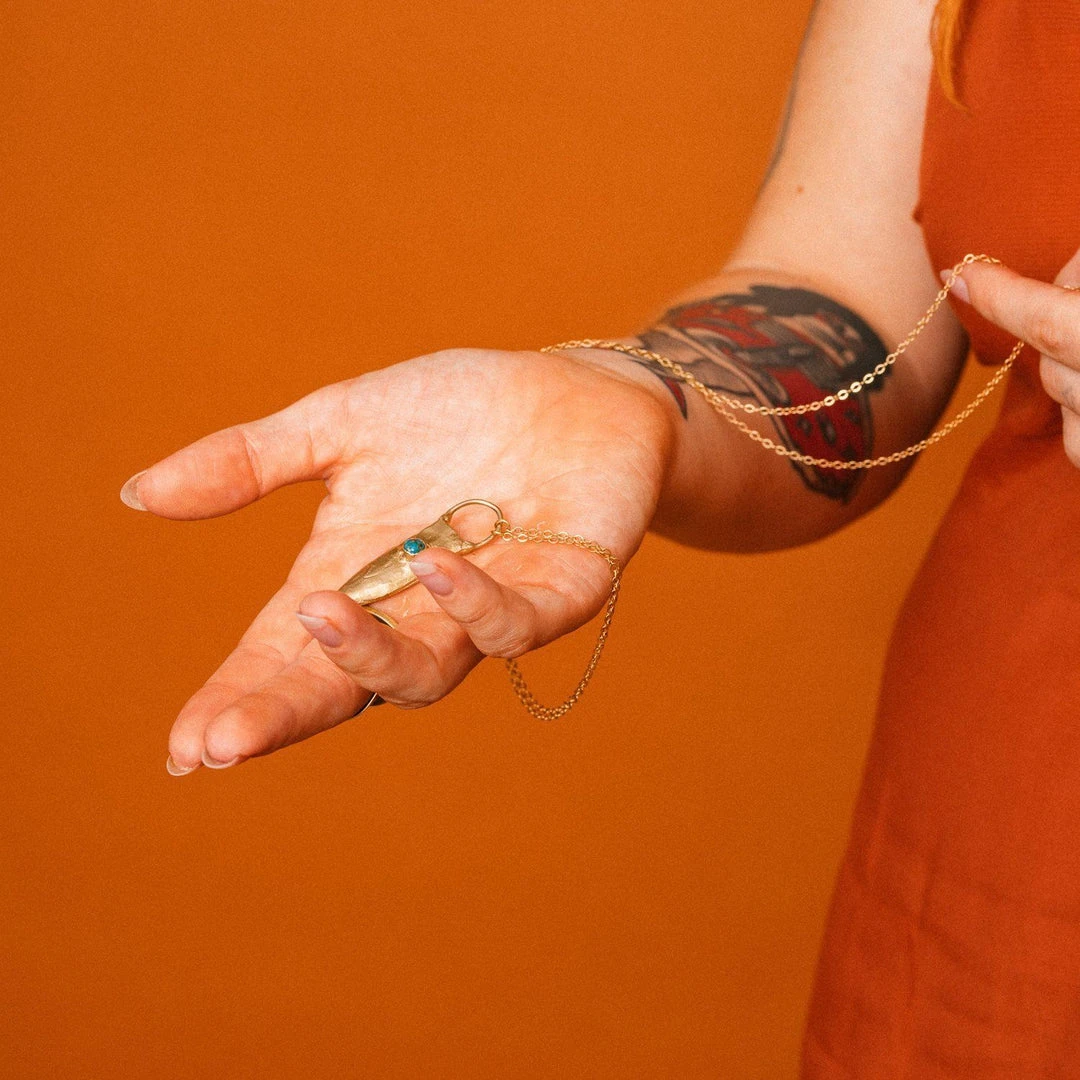 A brass shaped shield, reminiscent of a protective talisman, holds a circular stone of your choice. The hollow arch above the shield holds the chain, allowing it to lay above the bellybutton.