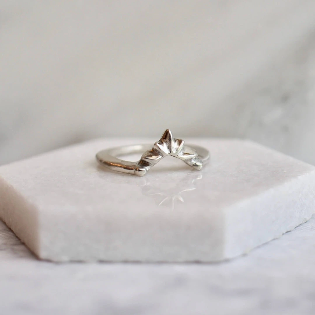 This cute stacking ring features shiny little sun rays that dance across your finger. It nests particularly well with The Sunstone Hex Ring. It also wears well with other rounded rings or is cute just on it’s own.
