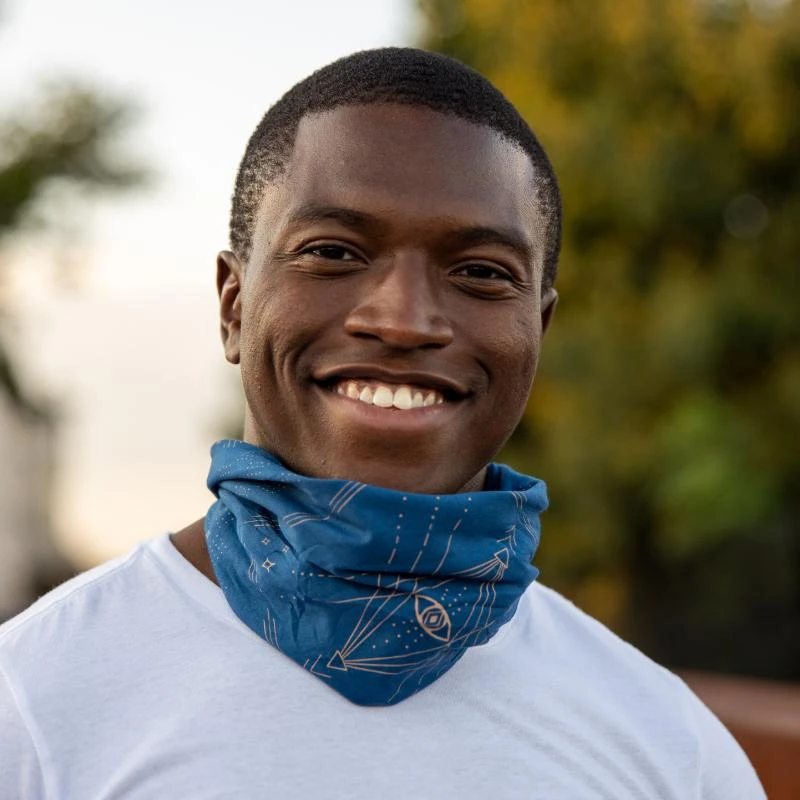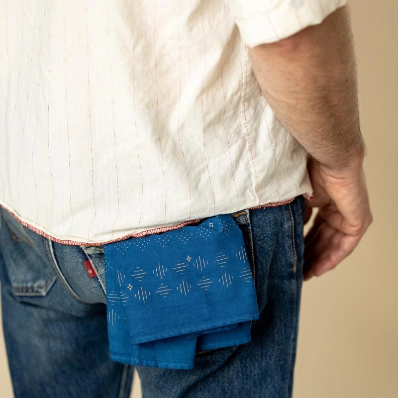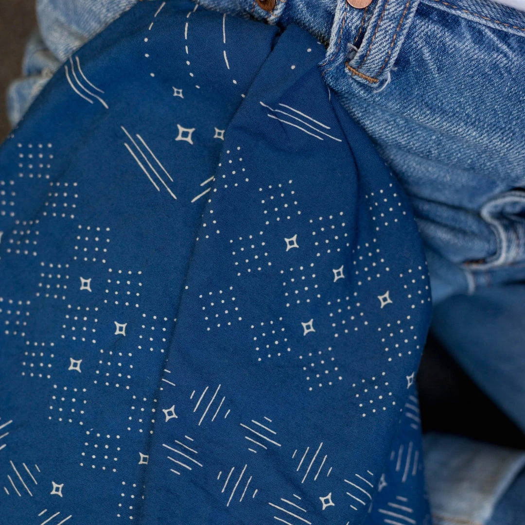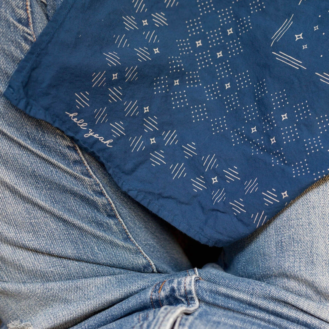 Use this bandana as a talisman to encourage moxie. Wear or tuck this super soft hand-dyed and triple washed bandana to add interest to any ensemble. This bandana features a hand-drawn design that is printed onto cotton.