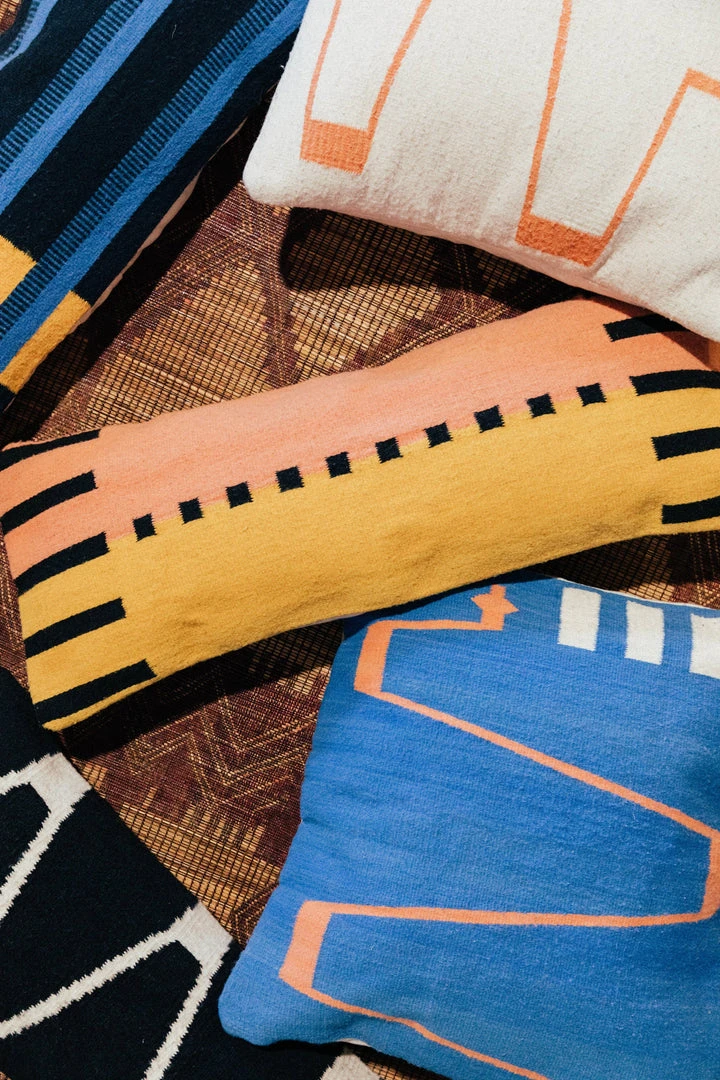 The Ladders lumbar pillow is made of wool that has been spun, woven, and dyed by hand. Each pillow is crafted by an artisan collective in Oaxaca, Mexico. The yarn is hand dyed with naturally derived dyes cultivated by the artisans. Due to the handcrafted nature, slight color variation may occur.