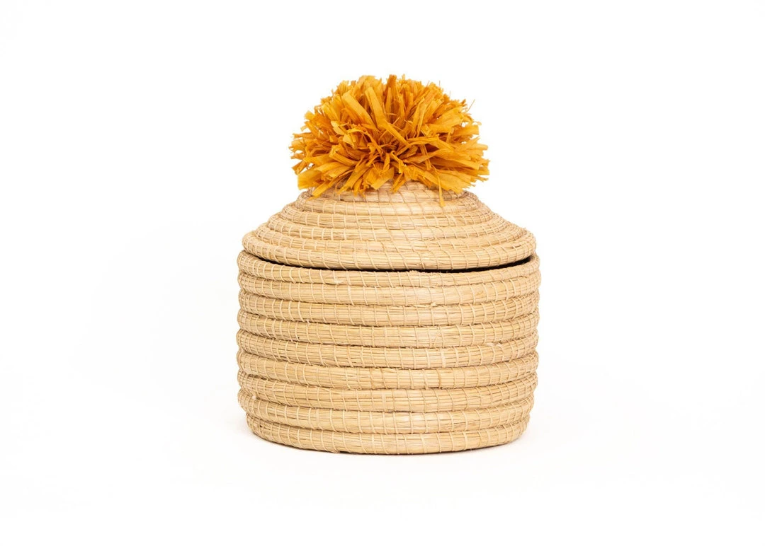 This carefully dyed raffia fiber and sweet grass pom pom basket makes a stunning and unique statement piece. Style it on a shelf for additional storage or add it to your coffee table for an eclectic feel. This basket is just the right size to hold your keys or jewelry.