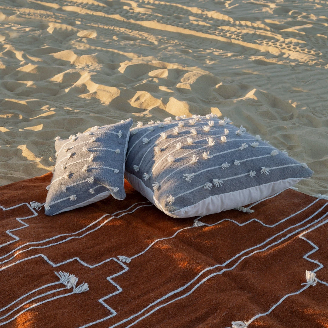 All of Kiliim’s products are handcrafted, which makes each product unique. All cotton in Kiliim products is premium Egyptian cotton sourced from the local markets, and then rolled, spun and dyed in digital dye houses in Cairo. All of the colored wool yarn in their rugs and pillows is spun from upcycled remnants from Cairo carpet factories to make use of fibers that may otherwise be discarded.