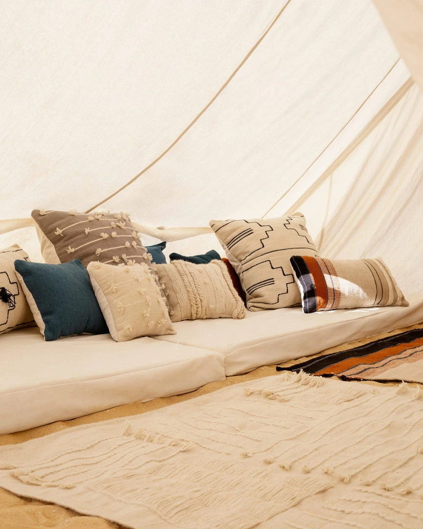 All of Kiliim’s products are handcrafted, which makes each product unique. All cotton in Kiliim products is premium Egyptian cotton sourced from the local markets, and then rolled, spun and dyed in digital dye houses in Cairo. All of the colored wool yarn in their rugs and pillows is spun from upcycled remnants from Cairo carpet factories to make use of fibers that may otherwise be discarded.