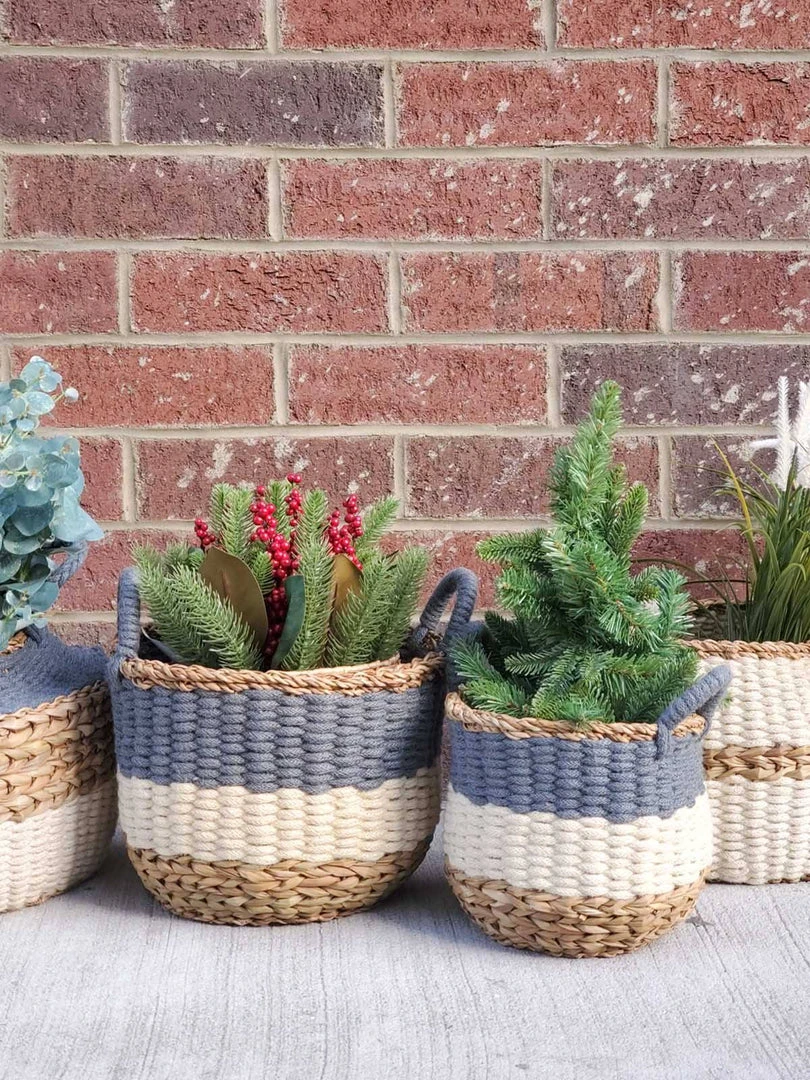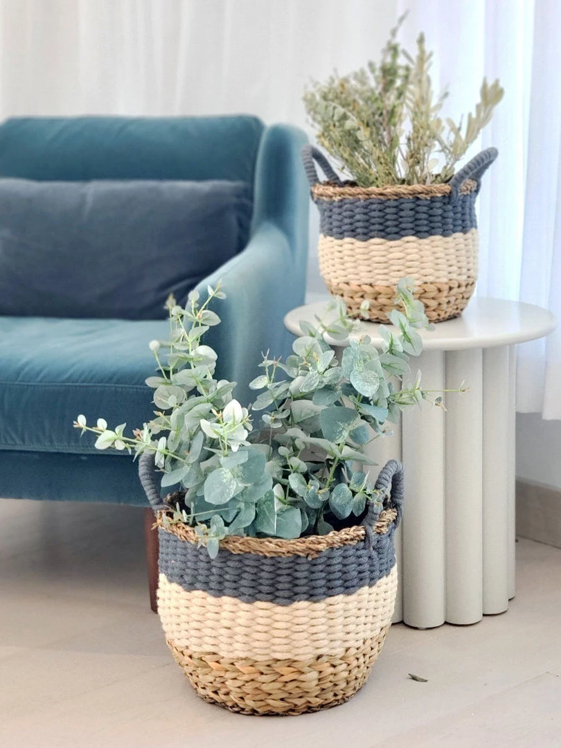 A set of two striped seagrass baskets, one of each size, to create attractive storage while adding natural texture to your home. Each basket is made with ethically sourced, natural materials and handwoven in a fair trade environment. Variation is celebrated with handcrafted products.