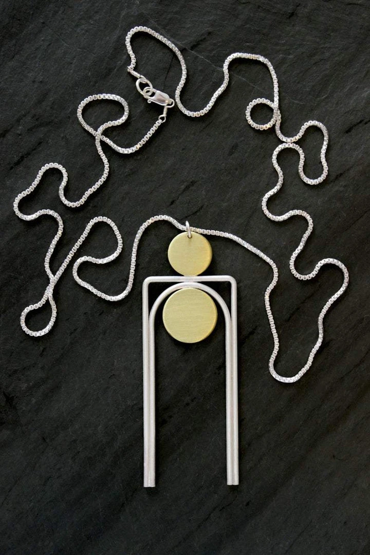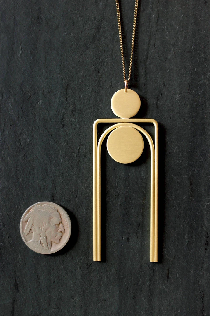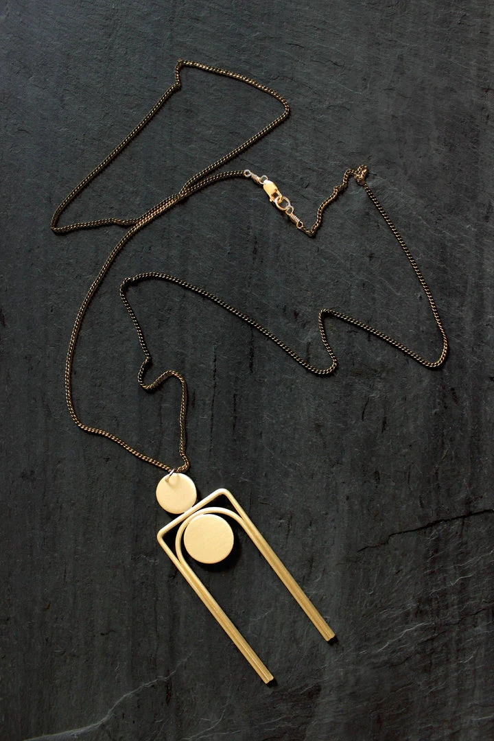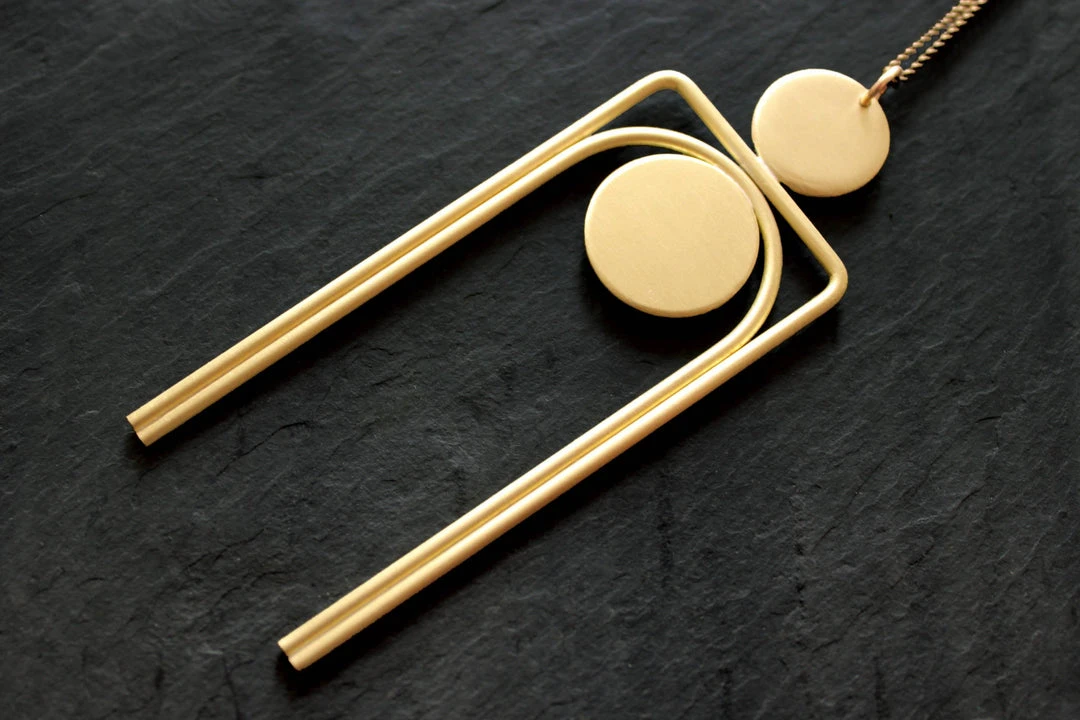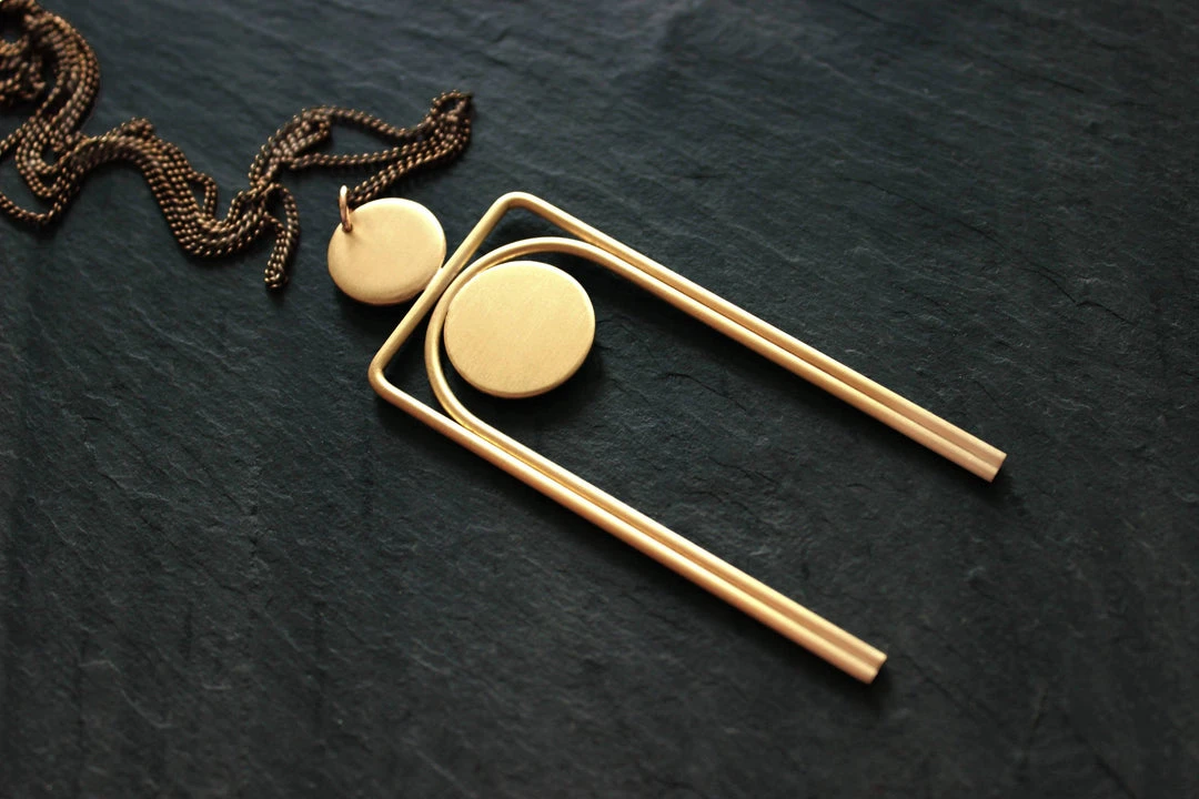 This simple, geometric necklace will add interest to any outfit. Featuring modern, playful shapes, it will quickly become your favorite statement piece.