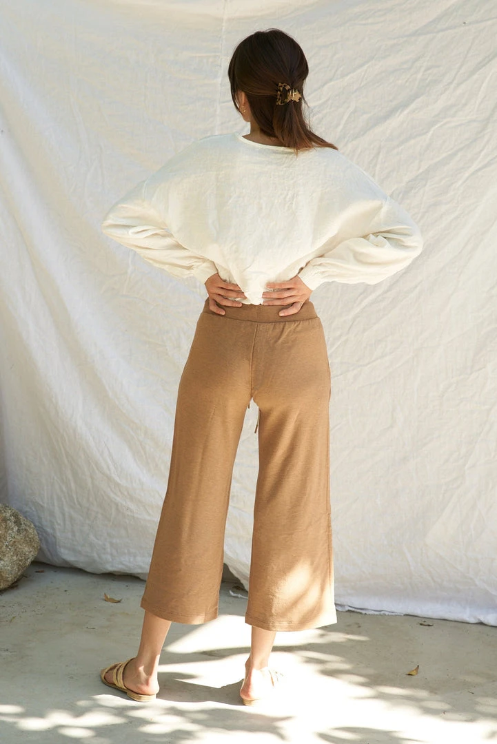This elevated Wide Leg Modal Crop Pant features a plush waistband, wide leg and raw edge detailing. The mid rise and roomy leg keep these relaxed for at home lounging or casual out-and-about looks.Â