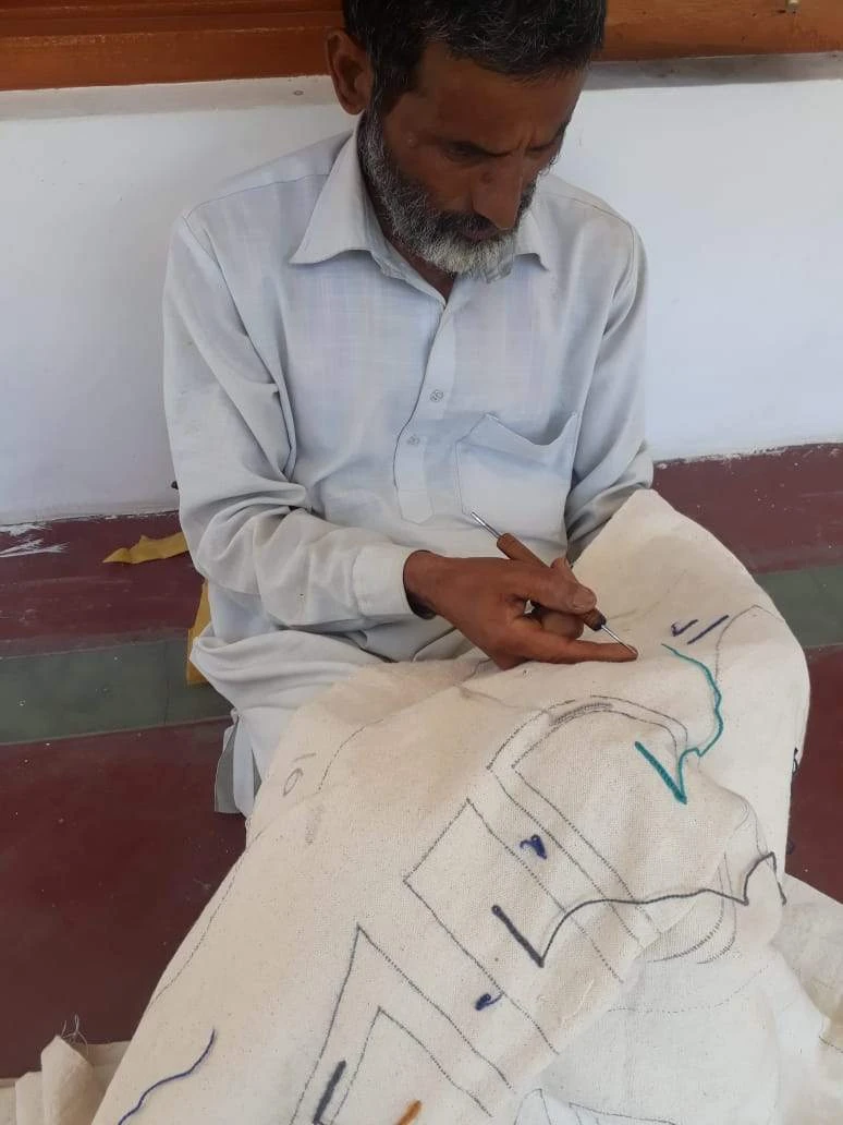 This modern, geometric tapestry has been ethically hand-embroidered by artisans in Kashmir, India, using a traditional embroidery technique that is native to this region.