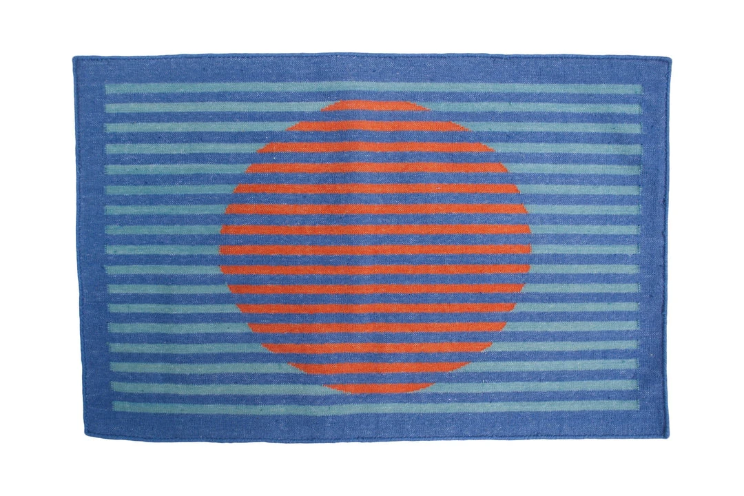 This geometric area rug has been ethically handwoven in the finest wool yarns by artisans in Rajasthan, India, using a traditional weaving technique that is native to this region. The purchase of this handcrafted rug helps to support the artisans and preserve their craft.