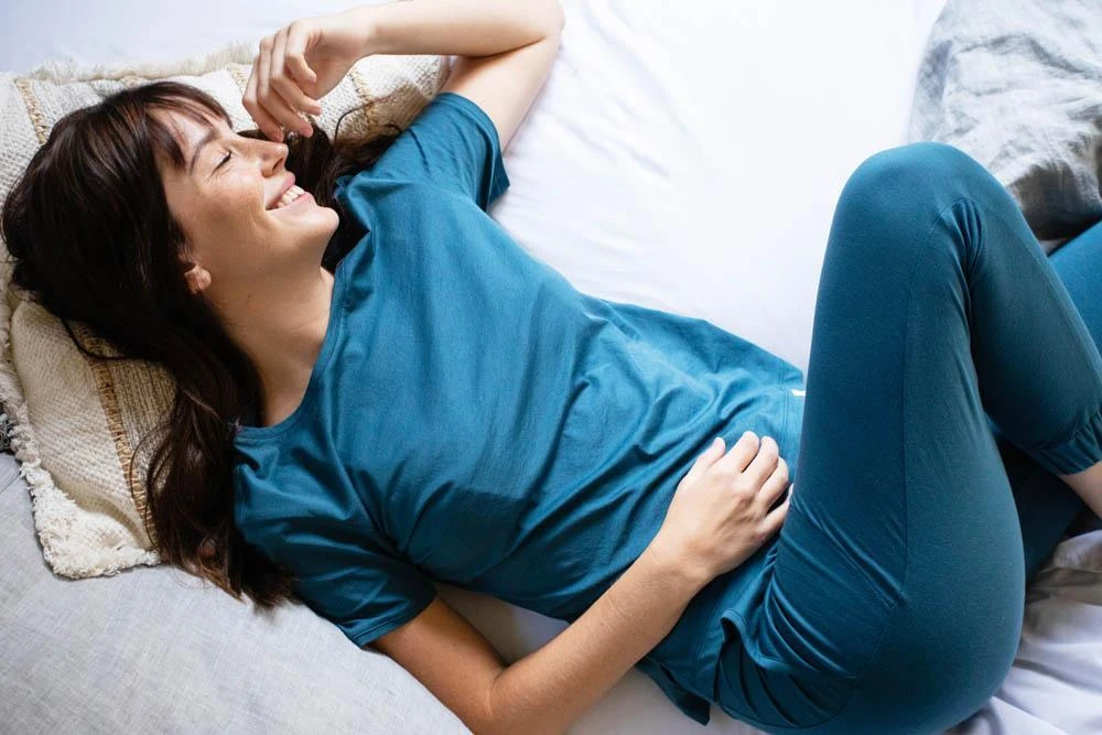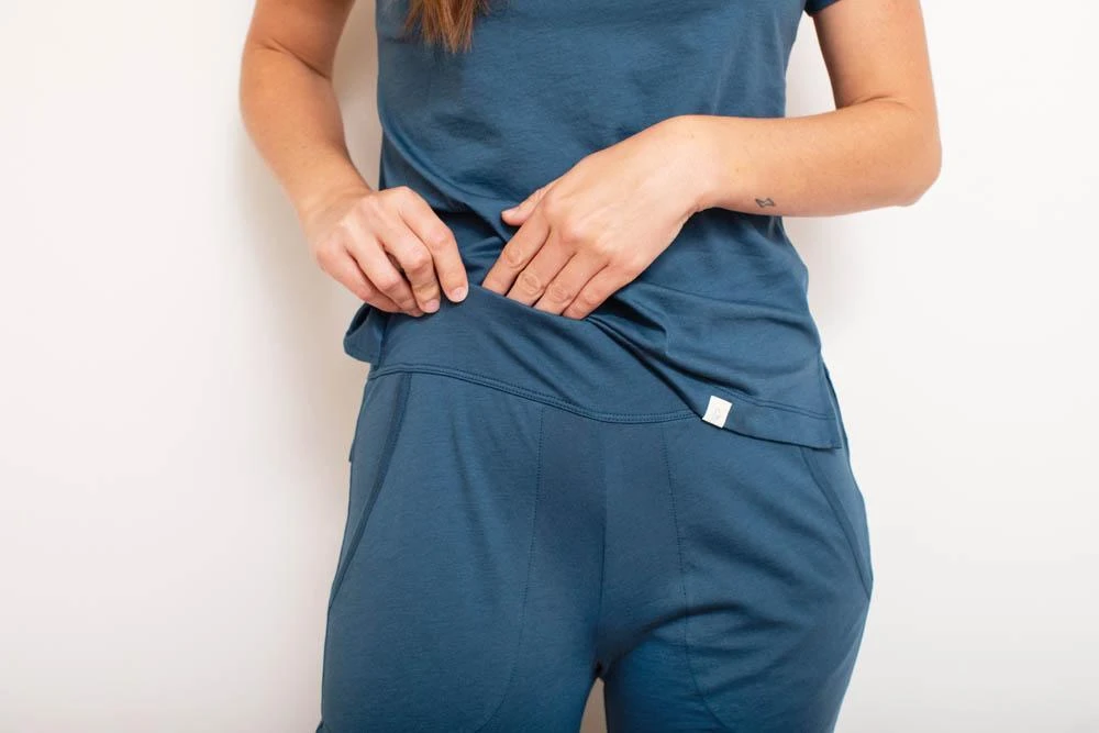 This soft, organic t-shirt and matching joggers bottom make this pajama set a dream for lounging or sleeping. The jogger-style bottoms are tapered at the ankles. Model wears size XS.