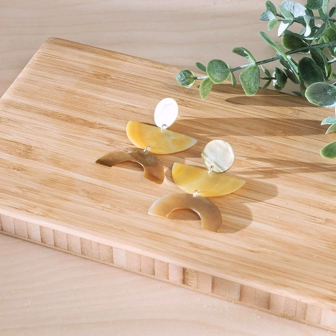 Hand carved, cut, and polished by master artisans, these statement geometric earrings add the perfect accent to any outfit. The mother of pearl is sourced as a byproduct of the food industry. Due to the material and production process, slight variations in color, pattern, or texture may occur naturally.