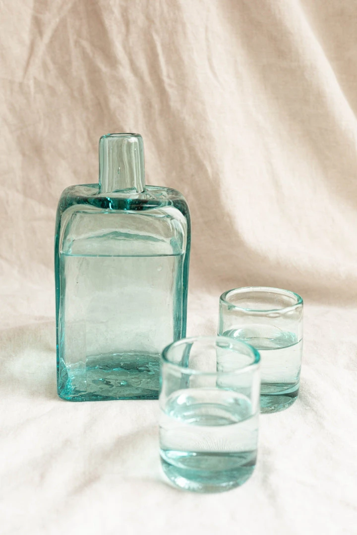 Use this rustic glass carafe with two tumblers to complement your nightstand or guest room. Tumbler may serve as a lid when not in use. Handmade from recycled, mouth-blown glass. Note: Slight variations may occur