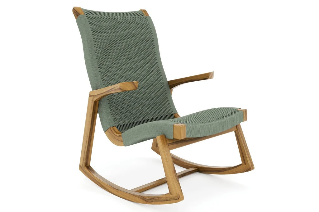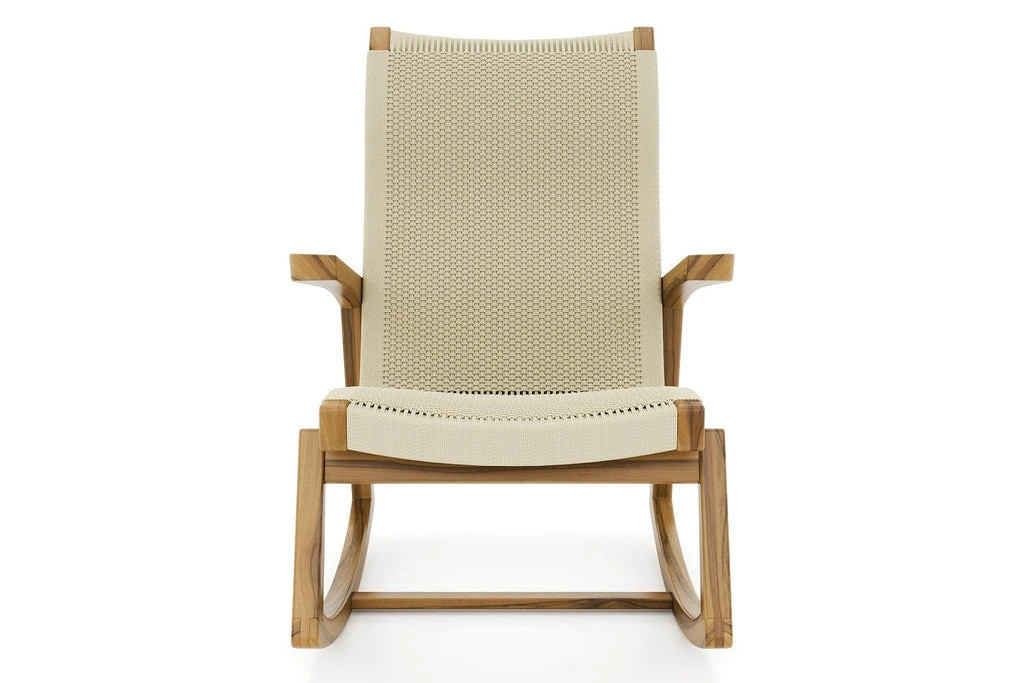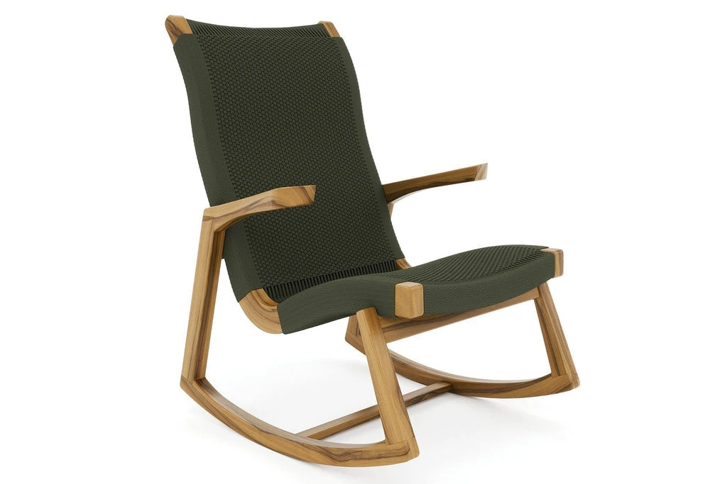This handmade rocking chair features mid century modern style and is crafted from sustainably sourced wood. Its curved design is perfect for relaxing while its handwoven pattern adds tasteful color to any room.