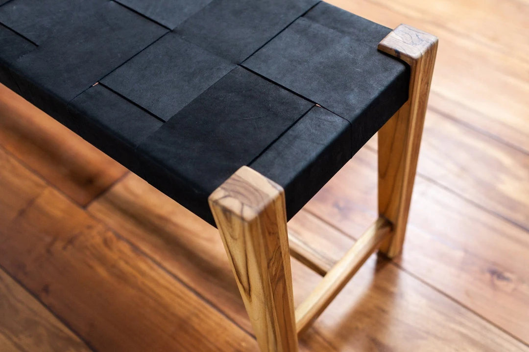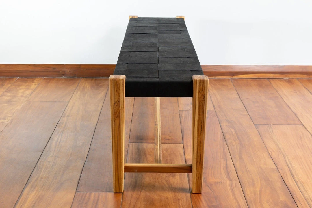 This bench is extremely durable and naturally beautiful. It is a one-of-a-kind piece that showcases the beauty of natural wood and leather in an environmentally friendly way. The genuine leather used to make this product is sourced from local Nicaraguan artisans and may contain slight and subtle variations in tone and texture.