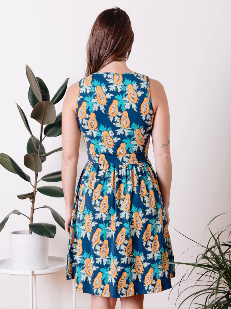 This tank dress has a full skirt, hidden pockets, and features organic cotton jersey in a bold papaya print. Versatile for any and all fun.