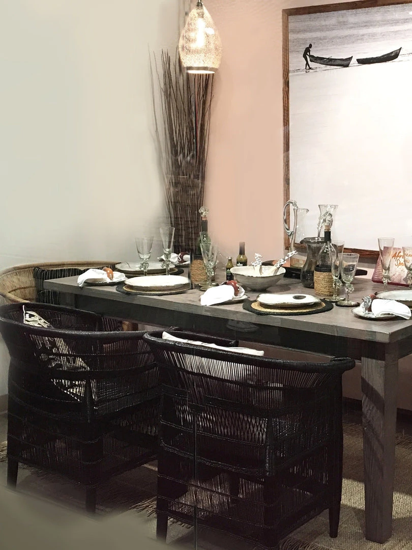 These intricately woven chairs provide authentic style from Malawi. Woven with strips of tropical bamboo, and made sturdy with blue gum tree wooden frame. Intricately detailed, naturally beautiful, the Malawi Cane arm chair adds comfort and style to any space. This striking black chair will pair nicely with any textile and can add a beautiful accent to your space indoors or out.