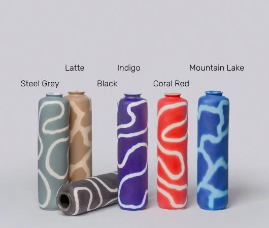 From left steel grey, latte, black, indigo, coral red, and mountain lake.